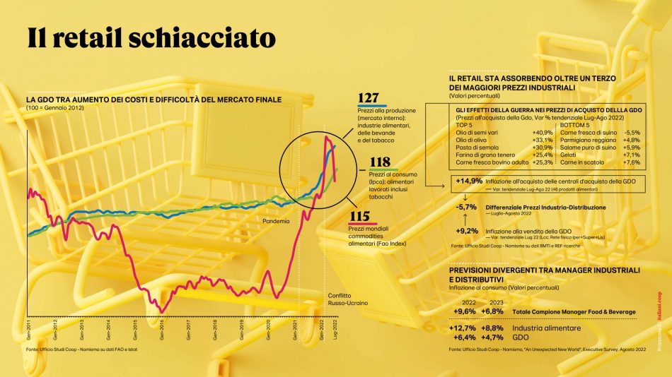 Il 2022 (e forse ancor di più il 2023) potrebbe essere l’anno più difficile della storia della grande distribuzione organizzata in Italia. Da un lato, infatti, le imprese retail devono fare i conti con l’eccezionale rincaro dei listini industriali e l’esplosione del caro energia. Dall’altro con le difficoltà della domanda finale e la necessità di attutire l’effetto sulla capacità di acquisto del consumatore. Ad oggi, infatti, i prezzi dei beni alimentari venduti dall’industria alle catene della gdo sono cresciuti del 15% sullo scorso anno (variazione % tendenziale luglio-agosto 2022-2021), mentre l’inflazione alla vendita nello stesso periodo ha fatto segnare un valore di poco superiore al +9% (il differenziale fra il prezzo all’acquisto e quello alla vendita segna un -5,7% a tutto svantaggio della grande distribuzione). E a schizzare in alto sono soprattutto i prezzi all’acquisto dei prodotti basici, così l’olio di semi segna un +40,9%, quello di oliva un +33,1% e ancora la pasta (+30,9%, la farina +25,4%). Contemporaneamente, dopo lo tsunami energia che si è abbattuto anche sulla grande distribuzione, i costi energetici che nel 2019 valevano l’1,7% del fatturato sulla base dei futures sull’energia si moltiplicheranno almeno per tre volte raggiungendo nel 2022 una incidenza del 4,7% e del 5,2% nel 2023. E questo drammatico incremento dei costi è tanto più preoccupante se si considera che il retail alimentare è un settore strutturalmente a bassa redditività, dove piccole variazioni dei margini possono seriamente compromettere la tenuta dei conti economici. Basti qui ricordare che (dati Mediobanca) il Valore Aggiunto trattenuto in media dalle imprese della gdo nel 2021 è stato pari a 14,7%, l’Ebitda del 5,3% e l’Ebit del 2,6%. Allo stesso modo ogni 100 euro spesi dal consumatore l’utile netto per i retailer è stato appena superiore ad 1,5 euro.