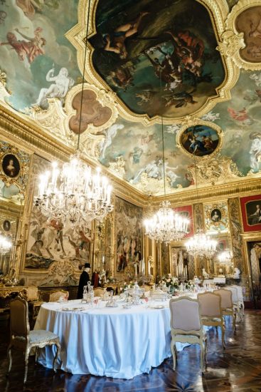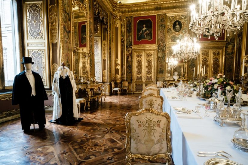 La “mise en table” del Palazzo Reale di Torino è impreziosita da cristalli e porcellane delle collezioni dei Musei Reali e presenta un allestimento scenografico realizzato in collaborazione con la Fondazione Teatro Regio di Torino. Ai lati della tavola, ci sono anche quattro manichini con abiti da sera maschili e femminili di fine Ottocento-inizio Novecento, allestiti dalla scenografa Claudia Boasso.