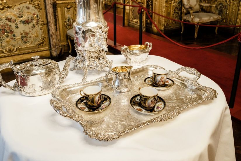 Il servizio, ammirato per l’eccellente qualità già all’“Expositions des Produits de l’Industrie” di Parigi nel 1834, segna l’evoluzione dei modelli decorativi dell’oreficeria verso un eclettismo di gusto inglese, con forme arrotondate che si adattavano alle esigenze della nascente meccanizzazione industriale. In particolare, al Palazzo Reale di Torino sono esposti 164 esemplari in prestito temporaneo dal Palazzo del Quirinale, realizzati da Charles-Nicolas Odiot, figlio di Jean-Baptiste Claude, a guida di una fiorente bottega orafa che tra la fine del Settecento e l’inizio dell’Ottocento forniva capolavori di oreficeria per l’aristocrazia francese e che annoverava tra i propri committenti anche Napoleone Bonaparte. La storia e l’identità del servizio sono state ricostruite grazie alle ricerche di Bertrand de Royere, che ha rintracciato anche i disegni preparatori della celebre Maison parigina, purtroppo dispersi in aste recenti.