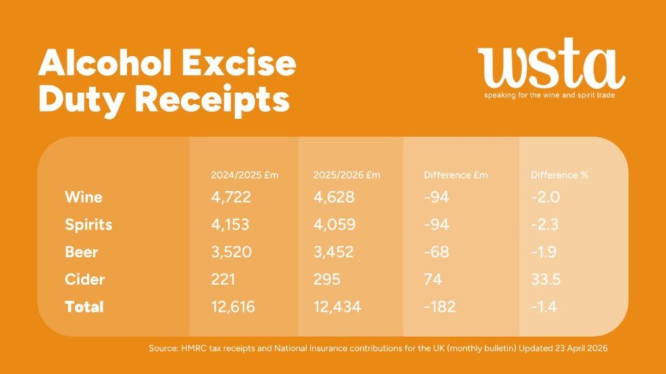 Il mercato del settore degli alcolici nel Regno Unito è uno dei più importanti a livello internazionale, ma c’è un tema che, da tempo, fa discutere il comparto produttivo portando a delle preoccupazioni, insieme al calo dei consumi: quello delle accise interne (come più volte raccontato da WineNews). E, ora, arrivano nuovi annunci per chiedere un’inversione di rotta dopo l’uscita degli ultimi dati della Hm Revenue & Customs (Hmrc), pubblicati e aggiornati al 23 aprile 2026 dall’autorità fiscale del Regno Unito, che mostrano come ci sia stato un calo nel periodo 2025-2026, sul 2024-2025, quantificabile, come si legge nel grafico pubblicato da Wine and Spirit Trade Association (Wsta), realtà che rappresenta oltre 300 aziende che producono, importano, esportano, trasportano e vendono vini e liquori in Uk, in 188 milioni di sterline tra vino (-2%, pari a 94 milioni di sterline perse per un totale di 4,6 milioni di sterline) e spirits (-2,3%, ovvero 94 milioni di sterline in meno per un valore complessivo di 4 milioni di sterline).
