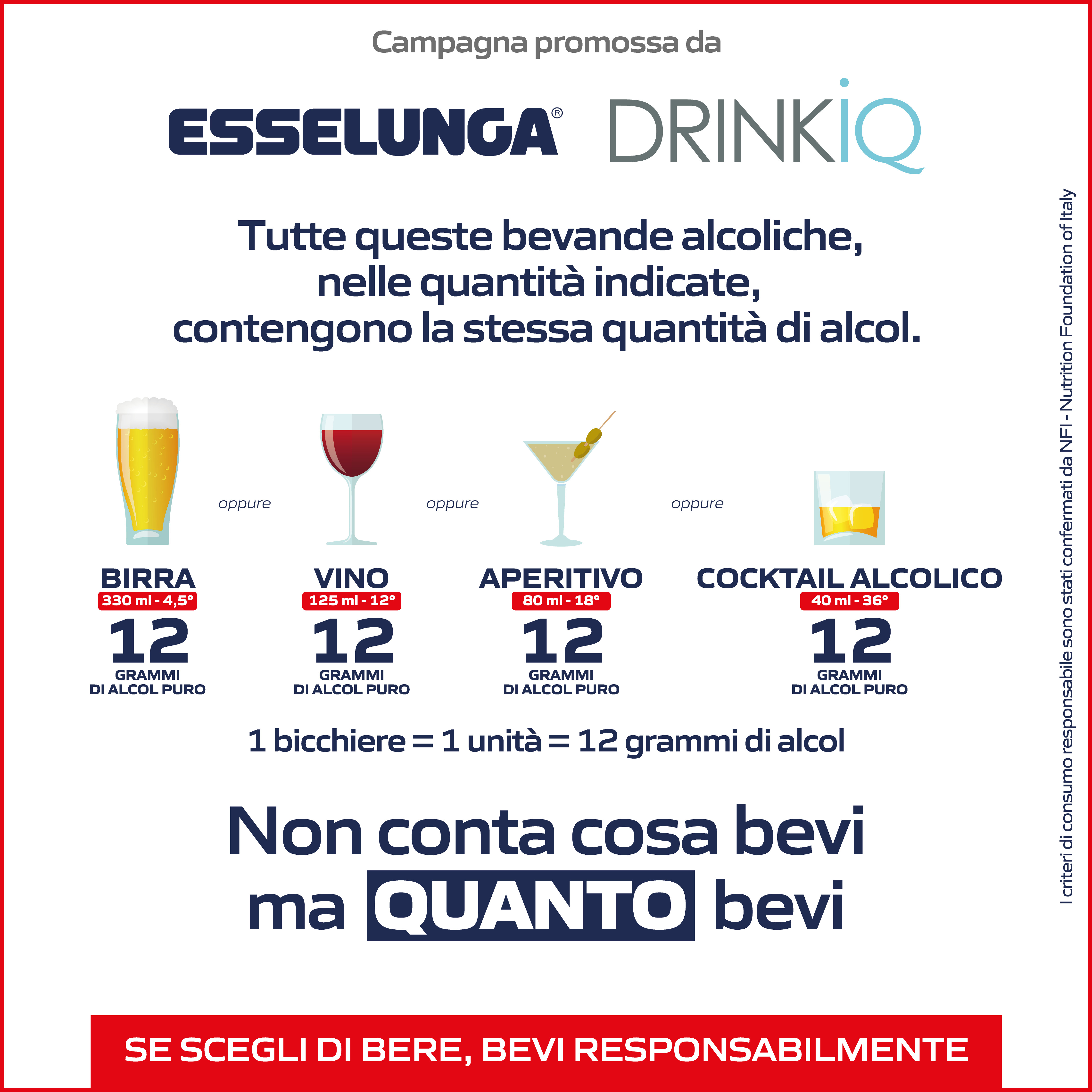 La campagna di sensibilizzazione interesserà 182 negozi Esselunga in 7 regioni, con il coinvolgimento anche dei Bar Atlantic del Gruppo. “Uno degli obiettivi principali di DrinkIQ è contribuire a superare preconcetti ancora diffusi - si legge ancora - tra cui l’associazione tra tipologia di bevanda e quantità di alcol. La campagna si configura così come uno strumento informativo rivolto al consumatore, volto a promuovere una comprensione più chiara e oggettiva del consumo: diverse quantità di vino, birra e spirits contengono, infatti, la stessa quantità di alcol. Questa iniziativa risulta particolarmente rilevante per lo stile di vita italiano dove il consumo di alcol è legato alla dimensione sociale.