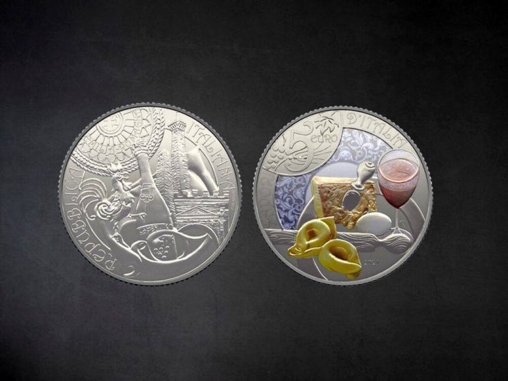 Una moneta con sul “dritto” un tortellino “ripieno” di una bottiglia di Lambrusco, e delle Torri della Grisenda e degli Asinelli con il galletto simbolo della Caveja, il rosone del Duomo di Modena e l’Arco di Augusto di Rimini, e sul “rovescio”, i tortellini ed un mattarello, uno spicchio di Parmigiano Reggiano con il tipico coltellino, un uovo, un calice di Lambrusco e un piatto in ceramica di Faenza; ma c’è anche quella con i cannoli siciliani con il loro inconfondibile ripieno di ricotta e frutta candita su un piatto di ceramica di Caltagirone, accompagnati da un calice di Passito di Pantelleria, da un lato, e, dall’altro, il Tempio della Concordia della Valle dei Templi di Agrigento, il Teatro Antico di Taormina, un ramo di mandorlo, il mare e la Trinacria, la testa femminile con le tre gambe piegate; un’altra, infine, raffigura da una parte un inconfondibile vasetto, quello della Nutella, e, dall’altra, il più grande stabilimento italiano del Gruppo Ferrero, quello di Alba. Nella nuova Collezione Numismatica 2021, la Zecca di Stato celebra anche l’enogastronomia italiana ed i suoi simboli, “coniandola” nelle monete i cui soggetti - 15 in tutto - sono ispirati alla storia, all’arte, allo sport, alla scienza, alla natura ed alle eccellenze del cibo e del vino, ovvero alle bellezze dell’Italia. Ma anche all’attualità, con le tematiche della nuova edizione che “vogliono rappresentare un sentimento di unione e coesione nazionale che trova espressione nella celebrazione di personaggi, avvenimenti storici e artisti simbolo della nostra tradizione e della nostra cultura imprenditoriale, ma anche nella gratitudine nei confronti di chi, nell’ultimo anno segnato dalla pandemia da Covid-19, ha messo senza riserve la propria professiocnalità al servizio della collettività”.