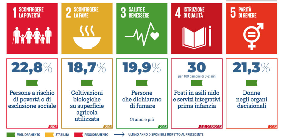 Nel 2023, è in sovrappeso o obeso il 44,6% della popolazione dai 18 anni in su. Il dato è stabile sul 2021. Tra le persone di 14 anni e più, 15,6 su 100 hanno abusato di alcol, come nel 2022. Ancora l’1,5% della popolazione italiana soffre di insicurezza alimentare (-0,8% sull’anno precedente). La quota è significativamente più alta nel Mezzogiorno (2,7%). Continua a crescere, nel 2022, la quota di bambini e adolescenti sovrappeso: 33,5% nella classe 3-5 anni (+2,7 p.p. dal 2017) e 27,2% nella classe 3-17 anni. Elevata, ma in calo, l’occupazione irregolare in agricoltura (23,2% nel 2021, -1,2% sull’anno precedente); nel Mezzogiorno gli occupati irregolari sono il 30,2%. Nel 2022, invece, diminuiscono fertilizzanti e fitosanitari distribuiti in agricoltura (-26,6% e -11,6% sull’anno precedente) e le emissioni di ammoniaca del settore agricolo (-11,7%). Mentre continua a crescere la quota di superficie agricola coltivata con metodi biologici, con le aree agricole convertite o in conversione che investono il 18,7% della superficie agricola utilizzata (Sau) in Italia, proseguendo in una crescita regolare e sostenuta (+1% all’anno dal 2012) con l’Italia al quinto posto tra i 27 Paesi Ue. Sono alcune delle indicazioni e delle statistiche relative ad agricoltura e alimentazione del “Rapporto Istat sugli Obiettivi di Sviluppo Sostenibile (Sustainable Development Goals - SDGs)” 2024, con l’aggiornamento e l’analisi delle misure statistiche finalizzate al monitoraggio dell’Agenda 2030 delle Nazioni Unite.