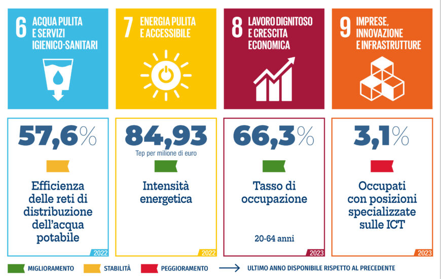 Ancora, guardando ad un tema attualissimo come la gestione dell’acque, l’Italia si colloca al terzo posto tra i Paesi dell’Ue27 per il prelievo pro capite di acqua per uso potabile (155 metri cubi annui, dato 2022). Le reti comunali di distribuzione hanno erogato nel 2022 ogni giorno 214 litri di acqua per uso potabile per abitante (36 litri in meno del 1999). Ma restano criticità nelle reti di distribuzione dell’acqua potabile: l’efficienza si attesta al 57,6%. Tra il 2017 e il 2023, l’Italia registra un progresso nel grado di attuazione della gestione integrata delle risorse idriche, dal livello medio-alto (55) al livello alto (78). Ma una famiglia su tre non si fida di bere l’acqua del rubinetto e quasi una su dieci lamenta irregolarità nella distribuzione dell’acqua nell’abitazione.