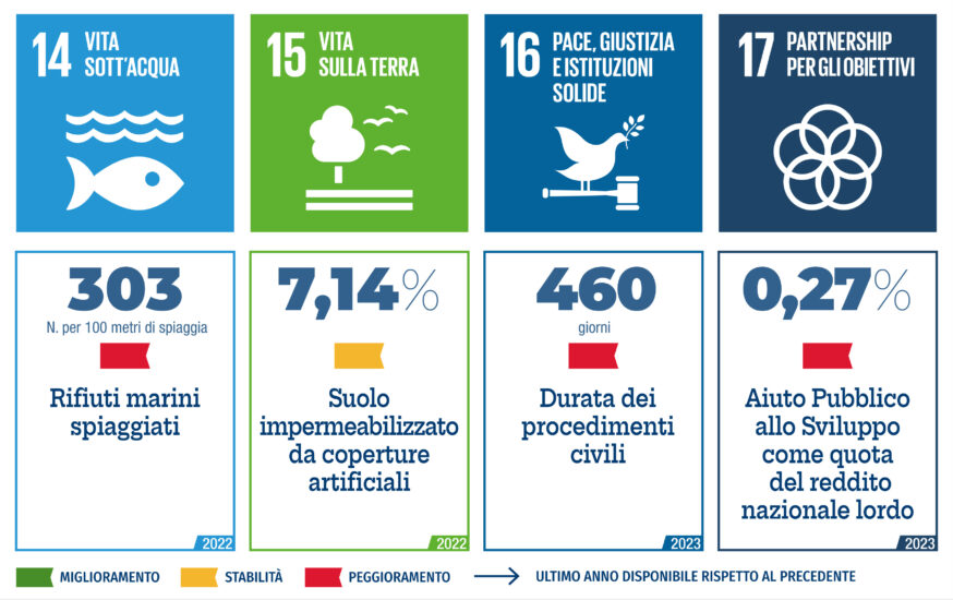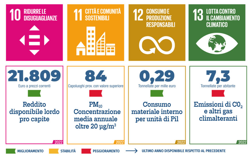 Ancora, nel 2022, le aree protette coprivano il 21,7% del territorio nazionale. L’obiettivo della Strategia nazionale per la biodiversità è di raggiungere il 30% entro il 2030. Le superfici forestali certificate, nel 2022, sono aumentate del 4%, ma la loro estensione in rapporto alle aree forestali resta molto inferiore alla media europea. In lieve calo la copertura vegetale delle aree montane (-0,2% tra il 2012 ed 2022); oltre il 20% delle perdite si localizza in alta montagna (sopra 1.000 metri di altitudine).