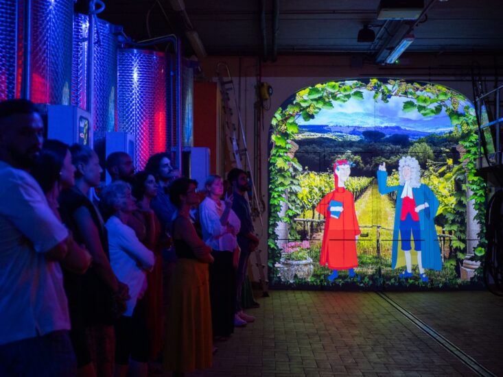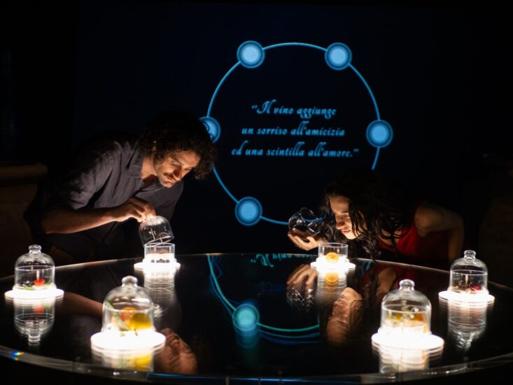 A condurre i visitatori lungo il viaggio interattivo alcuni personaggi illustri, da Pellegrino Artusi a Francesco Redi guidati da Dante Alighieri. “L’incontro con figure storiche è risultato essenziale per esplorare l’affascinante processo che porta l’uva dalla vigna al bicchiere, alla scoperta del vino attraverso i cinque sensi”, commenta Giulia Lazzaretto, creative designer di Drawlight.
