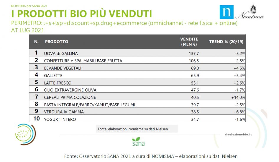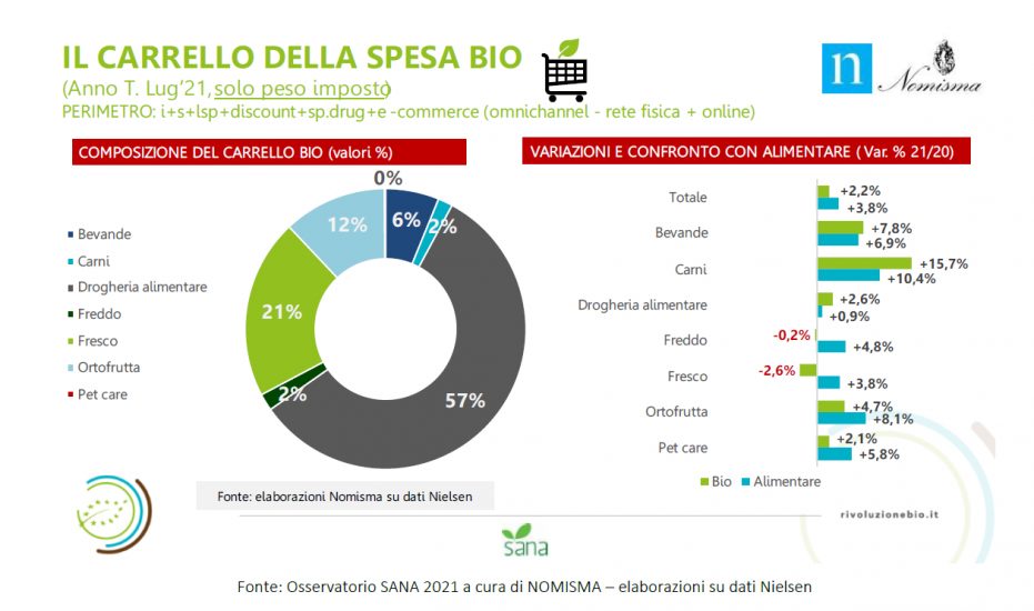 La composizione degli acquisti bio in distribuzione moderna identifica la drogheria alimentare (pasta, prodotti da forno, conserve, sughi ...) la prima categoria per vendite a valore - con una incidenza pari al 57% del totale del carrello; seguono i prodotti freschi - formaggi, salumi, yogurt, uova - (21%) ed ortofrutta (12%). In merito alle referenze, sono uova, confetture e spalmabili a base di frutta, bevande vegetali i prodotti più venduti.