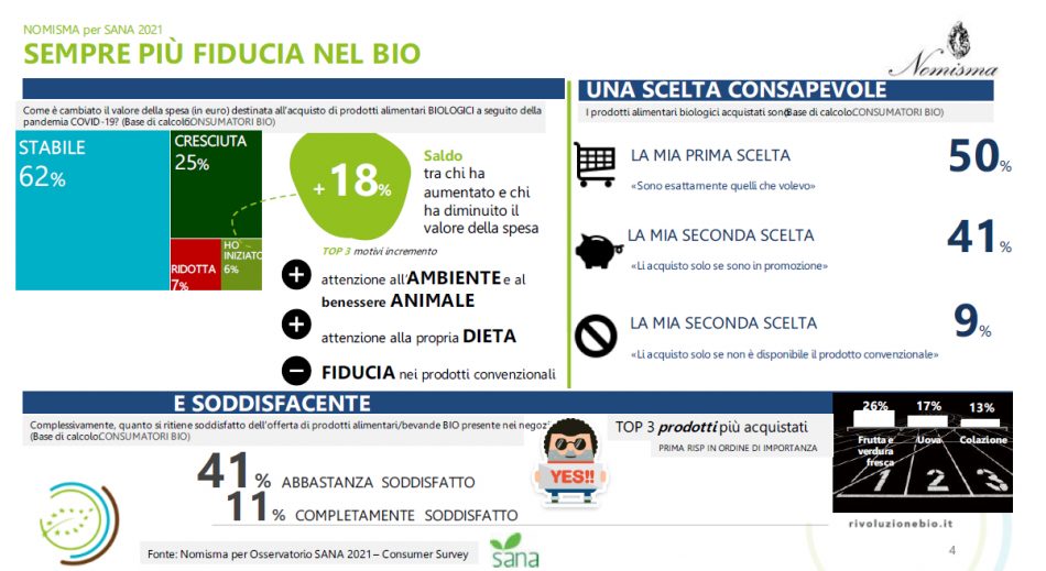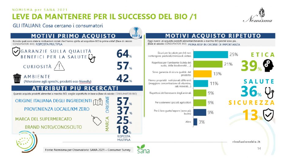 La dinamica dei consumi e le vendite nei diversi canali si è resa possibile grazie all’evoluzione degli assortimenti: il 52% dei consumatori si dichiara soddisfatto rispetto all’offerta a scaffale (anche se solo l’11% lo è completamente). Questo ha innalzato il livello di fedeltà di molte famiglie italiane, che non hanno modificato le proprie abitudini di acquisto verso il bio neanche durante la pandemia: il 62% degli user bio, infatti, continua a comprare bio come nel pre-Covid e il 25% ha addirittura aumentato la propria spesa, spinto da necessità salutistiche e scelte sostenibili sempre più impellenti. Complessivamente tra gli attributi incentivanti all’acquisto di biologico c’è la provenienza: il 57% decide di comprare un prodotto bio se gli ingredienti sono di origine italiana e il 37% se la sua provenienza è locale o a km zero.