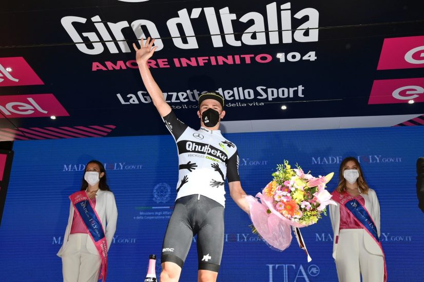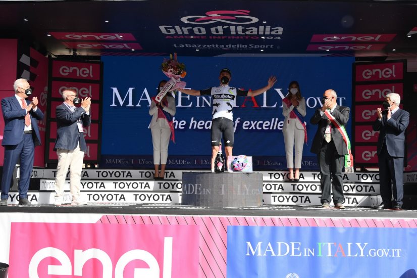 L’arrivo del giovanissimo svizzero Mauro Schmid, braccia alzate al cielo, a Montalcino, dopo una fuga lunga quanto tutta la tappa, quasi impossibile secondo tutti i pronostici, con la carovana rosa coperta dalla polvere delle strade bianche, che ha regalato spettacolo e fatto selezione, regalando emozioni a non finire, come ci si aspettava. Una tappa magica, la “Brunello di Montalcino Wine Stage”, partita da Perugia subito con una fuga a 11 (Lawrence Naesen della AG2R Citroën, Dries De Bondt della Alpecin-Fenix, Enrico Battaglin della Bardiani-CSF-Faizanè, Francesco Gavazzi della EOLO-Kometa, Simon Guglielmi della Groupama-FDJ, Taco van der Hoorn della Intermarché-Wanty-Gobert, Harm Vanhoucke, Roger Kluge della Lotto Soudal, Bert-Jan Lindeman, Mauro Schmid della Qhubeka-Assos e Alessandro Covi della UAE Team Emirates), che hanno solcando l’Umbria e costeggiando il Trasimeno, sono arrivati in Val d’Orcia Patrimonio Unesco, con un vantaggio di oltre 15 minuti. Poi gli sterrati sulle “strade bianche“ (che lo svizzero ama particolarmente) e tra i filari del Brunello di Montalcino, con i diversi passaggi sul passo del Lume Spento, che hanno fatto selezione e sgranato il gruppo, tirato a lungo da Filippo Ganna, e poi ulteriormente sfilacciato, con la maglia rosa Egan Bernal (Ineos Grenadiers) a controllare il distacco e gli altri uomini di classifica, insieme al compagno di squadra Gianni Moscon nel gruppo maglia rosa. A 10 chilometri dall’arrivo il vantaggio dei fuggitivi rimasti è di oltre 5 minuti, mentre perde strada, tra gli uomini di classifica, Remco Evenepoel (Deceuninck-Quick Step). In testa finiscono gli accordi e iniziano gli attacchi e le schermaglie, la voglia di vincere una tappa del Giro d’Italia destinata a restare nella storia per spettacolo, importanza è bellezza, prende il sopravvento sulla razionalità, e inizia a comandare il cuore. Non il fango, come quando nel 2010 il primo al traguardo di Montalcino fu Cadel Evans, ma la polvere è stata la grande protagonista, nonostante qualche goccia di pioggia che ha compattato lo sterrato sul finale. Dopo l’ultimo tratto, a 7 chilometri dall’arrivo, il vantaggio dei fuggitivi è ancora di 5 minuti. La maglia rosa Bernal attacca ancora sul finale, senza sosta, su un Passo del Lume Spento che, dopo tanti sali scendi sullo sterrato, ha fatto più selezione del previsto. Tra polvere e vigneti in fiore, diminuiscono i secondi di vantaggio dei fuggitivi dal gruppo maglia rosa, ma alla fine, tra le vie medievali del centro storico di Montalcino, per la vittoria di tappa è duello tra Mauro Schmid e Alessandro Covi, con lo svizzero a bruciare in volata l’italiano. Mentre il campione Bernal allunga ancora in classifica generale, in una tappa che, come da attese, si è confermata tra quelle che potrebbero decidere il Giro d’Italia n. 104.