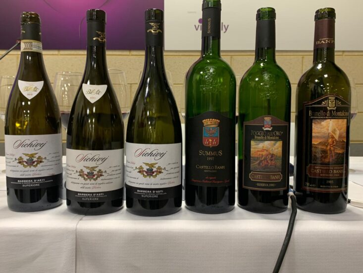 Dalla “seconda patria” di Rivella e da Castello Banfi, arriva il Brunello di Montalcino 1985, evoluto, ma non ancora spento nei suoi aromi terrosi, balsamici dai lampi di agrumi canditi, che introducono ad una progressione gustativa che gioca la classica partita del Sangiovese di Montalcino sul contrasto dolce-acido. Frutti scuri, china e tabacco segnano i profumi del Brunello di Montalcino Poggio all'Oro Riserva 1990, un vino concentrato e potente, dallo sviluppo compatto, che chiude su lampi acidi e rimandi fruttati. Infine il Summus 1997, il primo vino a Igt prodotto a Montalcino ed ottenuto da un blend a base di Sangiovese e Syrah. I profumi rimandano alla polvere di caffè e alla torrefazione con un successivo apporto fruttato intenso e rigoglioso. In bocca, il vino è morbido e avvolgente con qualche lieve cenno evoluto sul finale.
