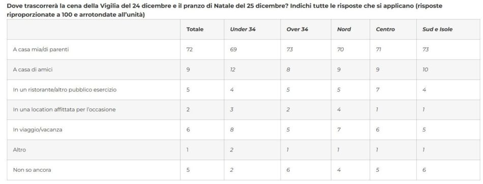 La dimensione “sociale” è presente, ma limitata: il 9% sarà a casa di amici, percentuale che sale al 12% tra i più giovani (contro l’8% degli over 34) e al 10% nel Sud e Isole.