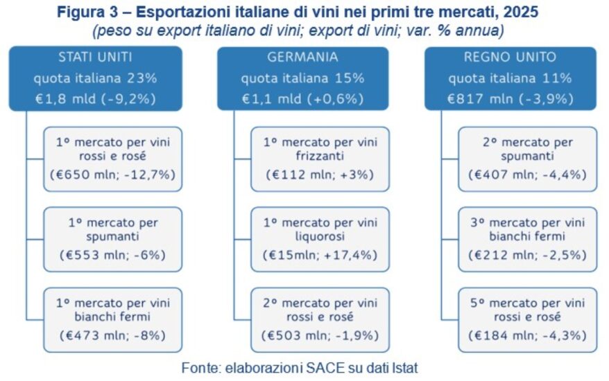 Esportazioni che per lo Stivale, nel 2025, sono state in contrazione del -3,7% per un totale di 7,8 miliardi di euro (come del resto già analizzato da WineNews su dati Istat) con Stati Uniti, Germania e Regno Unito a rappresentare i principali mercati di destinazione, che, insieme, valgono il 49% dell’export.