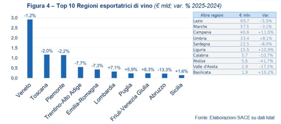 È il Veneto a guidare le esportazioni enoiche tricolore con 2,9 miliardi di euro, confermandosi saldamente al vertice delle regioni italiane, e più che raddoppiando il valore esportato dalla Toscana e dal Piemonte, che seguono con 1,2 miliardi di euro (seppur in lieve calo sul 2024).