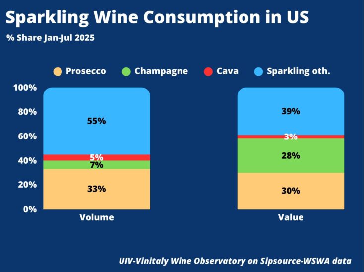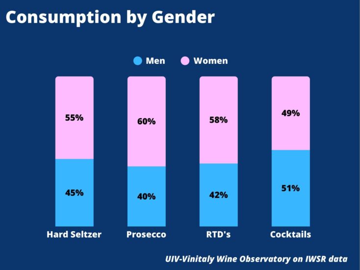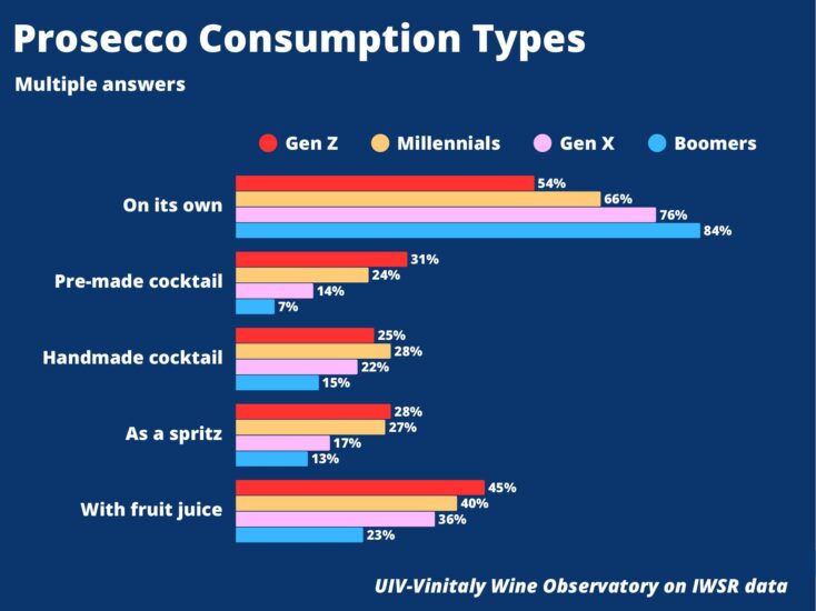 Il Prosecco rappresenta a valore l’87% delle vendite di spumanti italiani negli Usa e il 25% rispetto al totale del vino italiano. Ma al tempo stesso intercetta i trend della mixology, con una quota altissima della presenza tra i cocktail. Secondo Iwsr, infatti, al calice da vino si aggiungono diversi formati, dai ready-to-drink ai cocktail fatti al momento, dallo spritz al mix con succo di frutta, particolarmente apprezzato da donne e Gen Z.
