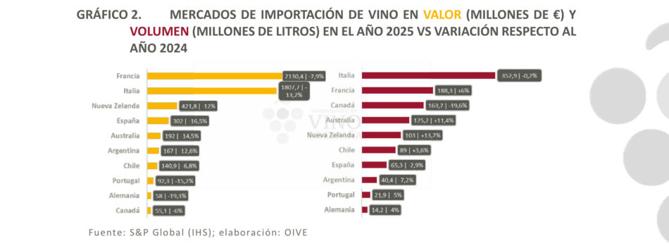 Analizzando i singoli Paesi, l’Italia è il secondo Paese per acquisti di vino in valore da parte degli Stati Uniti, nel 2025, a 1,8 miliardi di euro di export, ma con un calo significativo del -13,2%, mentre resta il n. 1 nei volumi che sono stabili, sul 2024, a 352,9 milioni di litri (-0,2%). Nel ranking dei mercati la Francia è leader in valore con esportazioni verso gli Stati Uniti a 2,1 miliardi di euro (-7,9%) e resta dietro all’Italia nei volumi, ma con numeri in crescita e, quindi, a +6% per 188,3 milioni di litri. Vedendo i mercati in termini di valore, tutti i Paesi sono in negativo: la Nuova Zelanda, terzo esportatore, segna -12% a 421,8 milioni di euro, davanti a Spagna (302 milioni di euro, -16,5%), Australia (192 milioni di euro, -14,5%), Argentina (167 milioni di euro, -12,6%), Cile (140,9 milioni di euro, -6,8%), Portogallo (92,3 milioni di euro, -15,2%), Germania (58 milioni di euro, -19,3%) e Canada (55,1 milioni di euro, -6%). Andando nel dettaglio dei volumi, dietro Italia e Francia c’è il Canada che registra il calo più pronunciato nei Paesi in “top 10”, -19,6% a 163,7 milioni di litri. Posizione n. 4 per l’Australia (125,2 milioni di litri, +11,4%), davanti a Nuova Zelanda (103 milioni di litri, +13,7%), Cile (89 milioni di litri, +3,6%), Spagna (65,3 milioni di litri, -2,9%), Argentina (40,4 milioni di litri, -7,2%), Portogallo (21,9 milioni di litri, -5%) e Germania (14,2 milioni di litri, -4%).