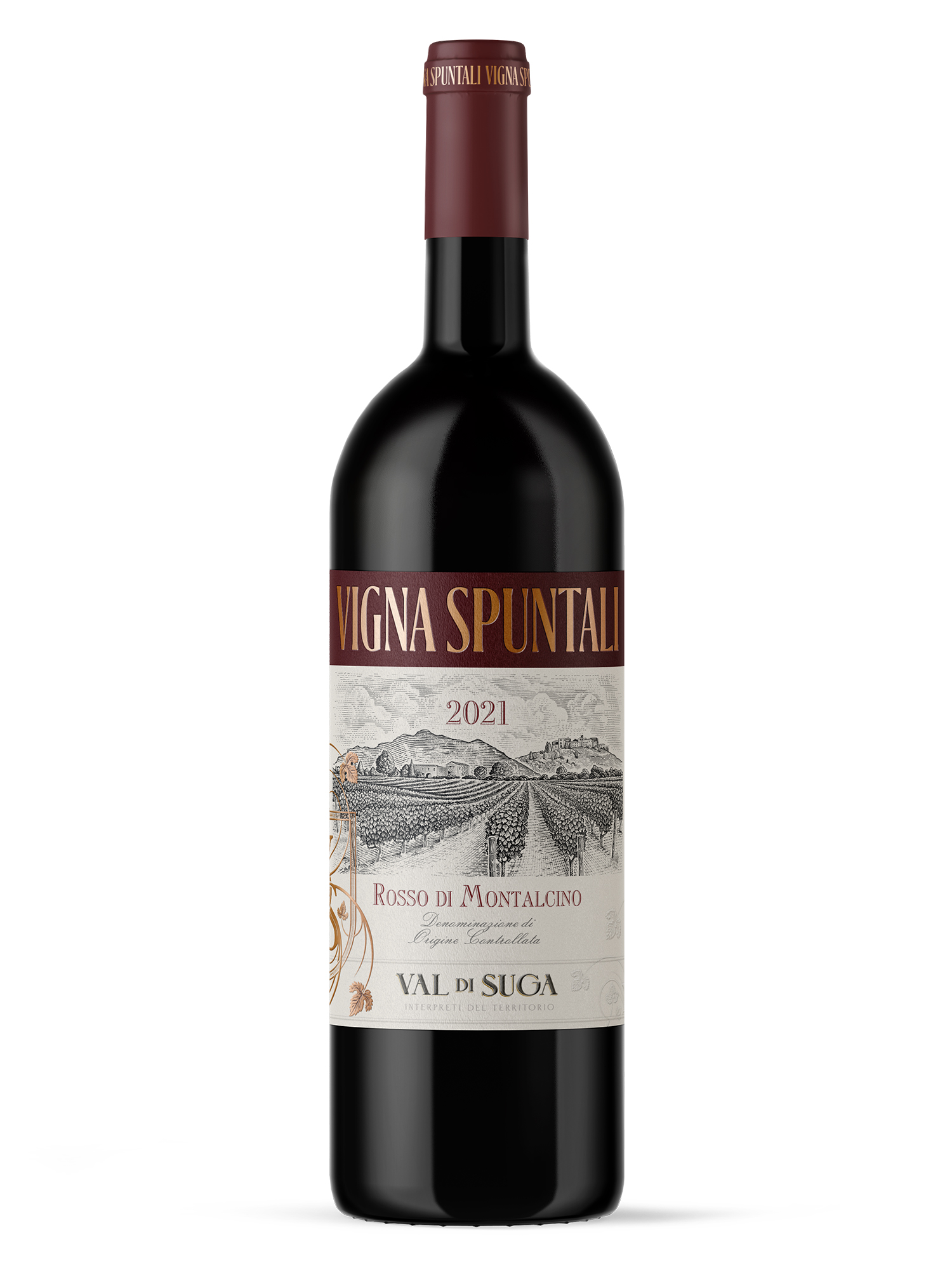 Val di Suga è il cuore ilcinese di Angelini Wines & Estates, che possiede anche San Leonino nel Chianti Classico, Tenuta Trerose a Montepulciano, Bertani in Valpolicella, Fazi Battaglia e San Sisto nei Castelli di Jesi e Puiatti nell’Isonzo. Val di Suga si trova nella parte orientale della denominazione, che guarda sulla Val d’Orcia, ma i vigneti - tutti coltivati a Sangiovese - sono suddivisi in 3 macro zone, poste su 3 diversi versanti. C’è Vigna del Lago, tutta attorno alla cantina: 18 ettari sui 280 metri di altezza, piantati su terreno argilloso che inglobano anche un laghetto, caratterizzati da clima continentale. C’è Poggio al Granchio, sul versante sud-orientale: 18,5 ettari posti a 450 metri di altezza su terreno a galestro, che si affacciano sul Monte Amiata e sulla sua influenza rinfrescante. C’è infine Vigna Spuntali, sul versante sud-occidentale: 15,5 ettari a 300 metri di altezza piantati su terreno sabbioso, che tendono verso il Mar Tirreno con il clima e la vegetazione mediterranei che suggerisce. Tutte e tre le vigne danno forma a 3 versioni di Brunello di Montalcino, ma solo da Vigna Spuntali nasce anche il Rosso di Montalcino Cru dell’azienda, in particolare dalla porzione più bassa del vigneto, quella più fresca. La versione 2021 è carnosa e piena, ma chiara: frutta in caramella e note ematiche anticipano un sorso ispido e intenso, dall’aderenza fruttata e dalla chiusura floreale.