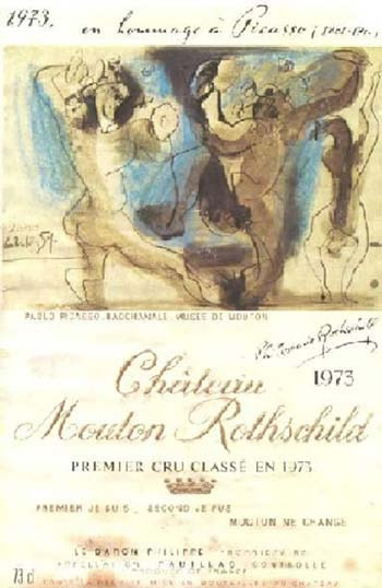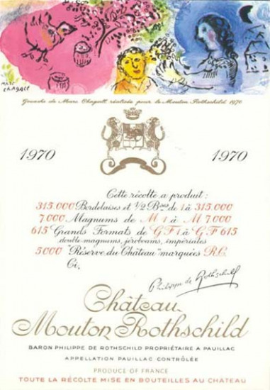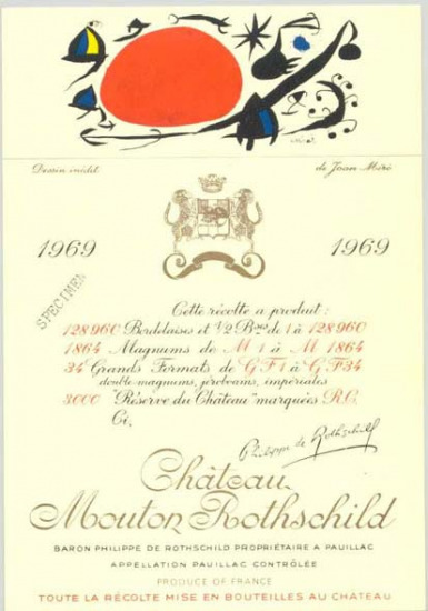 diciotto rarissime bottiglie di Château Mouton Rothschild impreziosite da etichette create dai più grandi maestri del '900. Fu il Barone de Rothschild, nel 1924, entusiasta per il successo della prima annata messa in bottiglia e non più venduta ai negotiants, a inaugurare la tradizione delle etichette d'artista con Jean Carlu ... il resto è