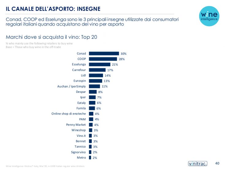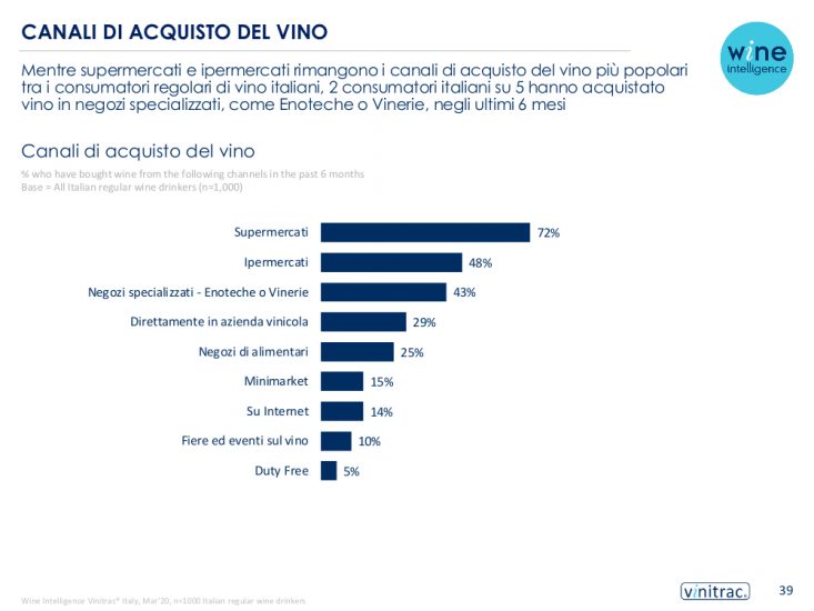 Sul fronte degli acquisti, almeno negli ultimi 3 mesi, il più gettonato è stato il Prosecco Doc (acquistato dal 24% degli italiani che hanno comprato vino), davanti al Montepulciano d’Abruzzo (19%) e al Lambrusco (15%). Tra in canali di acquisto, supermercati (72%) e ipermercati (48%) rimangono i canali di acquisto del vino più popolari tra i consumatori regolari di vino italiani, ma 2 consumatori italiani su 5 hanno acquistato vino anche in negozi specializzati, come enoteche o vinerie (46%), negli ultimi 6 mesi, mentre il 29% acquista direttamente in azienda, ed il 14% su internet. Le insegne in cui si acquista più vino sono Conad (30%), Coop (28%) ed Esselunga (21%), e ancora, tra le altre, il 6% utilizza Eataly come canale prevalente, il 3% realtà come Vino.it e Tannico, il 2% Signorvino. Tra le variabili che influiscono di più sulla scelta del vino domina la capacità di abbinamento al cibo, poi il fatto che sia una denominazione conosciuta o un marchio conosciuto. Poi vengono prezzo, Regione di origine e vitigno, e ancora il metodo rispettoso dell’ambiente, ed il grado alcolico più o meno elevato.
