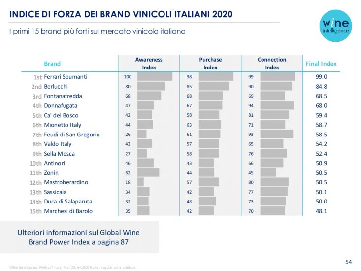 Le denominazioni più conosciute, invece, sono il Prosecco Doc (52% la percentuale di chi ha sentito parlare della denominazione), Brunello di Montalcino (51%), Montepulciano d’Abruzzo (50%), Chianti (48%), Chianti Classico (45%), Franciacorta (45%), Barolo (40%), Barbera d’Asti (40%), Lambrusco (40%), Asti e Moscato d’Asti (38%), seguiti da Primitivo di Manduria, Amarone della Valpolicella, Valpolicella, Vermentino di Sardegna, Conegliano e Valdobbiadene Prosecco Superiore Docg, Oltrepò pavese, Nobile di Montepulciano, Bardolino, Greco di Tufo e Morellino di Scansano. Mentre i i brand più forti in Italia, secondo il “Global Wine Brand Power Index”, sono, nell’ordine, Ferrari, Berlucchi, Fontanafredda, Donnafugata, Cà del Bosco, Mionetto, Feudi di San Gregorio, Valdo, Sella e Mosca, Antinori, Zonin, Mastroberardino, Sassicaia, Duca di Salaparuta e Marchesi di Barolo.