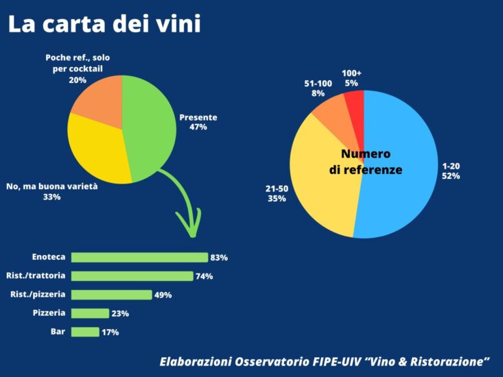 “Il settore conta 324.436 imprese, 1,5 milioni di addetti, consumi per 100 miliardi di euro e 59,3 di valore aggiunto e un importante impatto economico considerando che in media il vino pesa 21% del fatturato, con incidenza maggiore nei ristoranti tradizionali, superando il 30% per il 22% degli intervistati” ha illustrato Giulia Erba dell’Ufficio Studi Fipe-Confcommercio. Per gli imprenditori della ristorazione il vino non è solo una bevanda che accompagna il pasto, ma esalta l’offerta gastronomica e l’esperienza complessiva e contribuisce all’identità dell’impresa e alla fidelizzazione del cliente. La carta dei vini, utilizzata da 3 ristoranti su 4 ma anche dalla metà delle pizzerie-ristoranti (4,1 milioni le voci totali in carta), segue come criteri principali la valorizzazione territoriale, l’abbinamento gastronomico e le richieste dei clienti. Il 47% delle imprese ha una carta vini strutturata. Le carte includono in media 28 etichette, prevalentemente regionali, per valorizzare il territorio e la cucina tipica. Il 72,3% delle selezioni è curato dal titolare e quindi ridotto è il ricorso a sommelier interni o agenti. Tuttavia l’aggiornamento della carta avviene 1-3 volte l’anno nel 40% dei casi e solo una volta nel 54% dei casi. Questo scarso ricambio, stando ai dati raccolti, si inserisce in un contesto di scarsa formazione in materia enologica dei ristoratori: in un terzo dei locali non si registrano forme di aggiornamento (quota che sale al 61% nelle pizzerie e al 50% nei cocktail bar), e la metà di chi si forma lo fa attraverso il passa parola con agenti o distributori”.